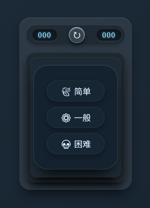 - 重启按钮(restart):圆形按钮,点击后弹出难度选择浮层,可随时开始新游戏。